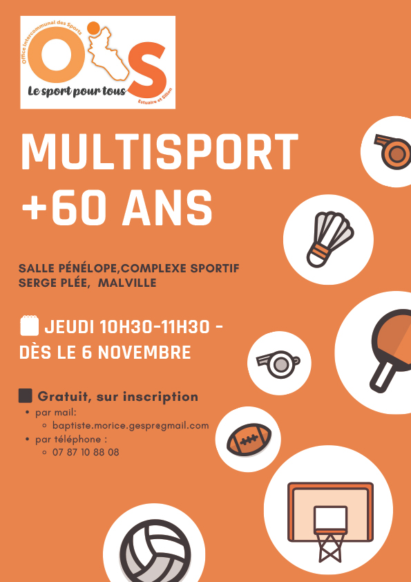 Office Intercommunal des Sports : multi-sport gratuit pour les + 60 ansL'Office Intercommunal des Sports propose des créneaux de multi sport pour les + de 60 ans, à partir de jeudi 6 novembre.Publié le 30 octobre 2025 Séances de sport gratuites. Tous les jeudis de 10h30 à 11h30, Salle Pénélope - Complexe Serge Plée.Gratuit sur inscription : par mail baptiste.morice.gespr@gmail.compar téléphone 07 87 10 88 08 Selective focus on cheerful senior lady posing with fitness tools, multiracial group of healthy elderly people in sportswear doing strength building workout with dumbbells at gym PrécédentRetour à la listeSuivant